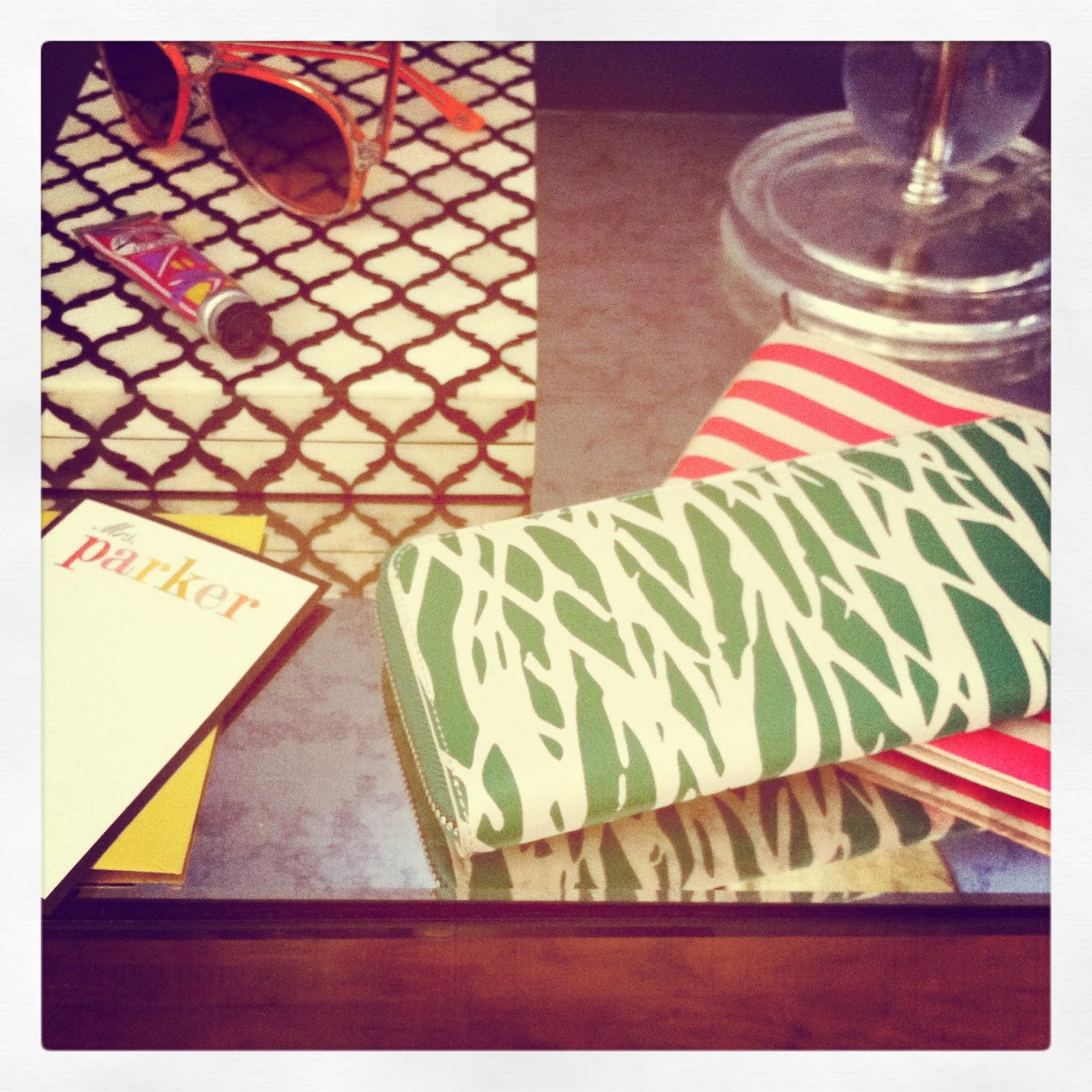 wallet (DVF), shades (Michael Kors), makeup bag (Rebecca Minkoff), notecards (Jennvitations), headphones (Target), kiddos and pooch (all mine), nail polish (Essie Nice is Nice), journal (Jcrew)