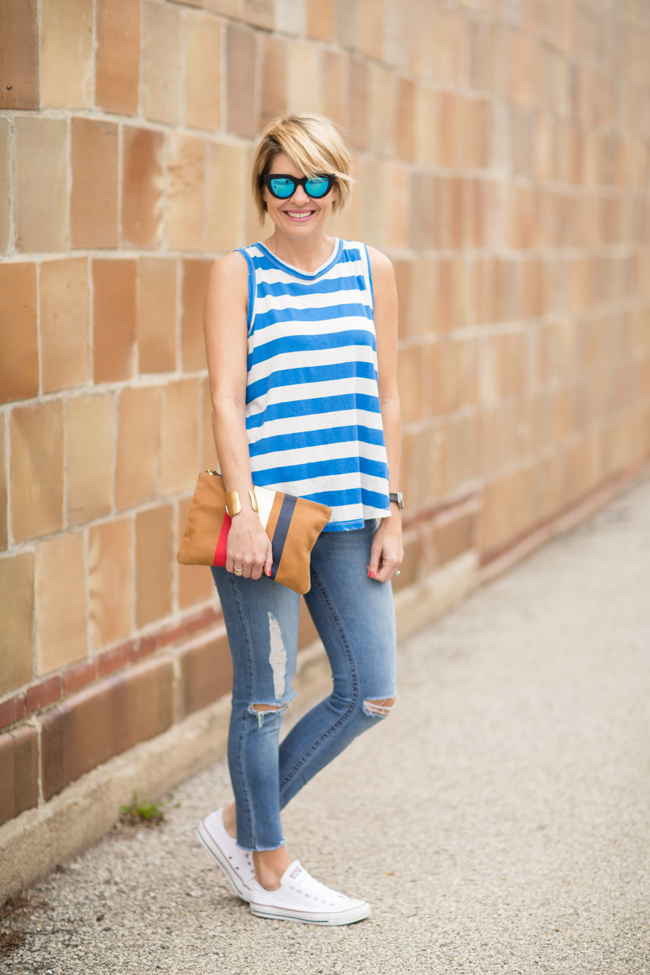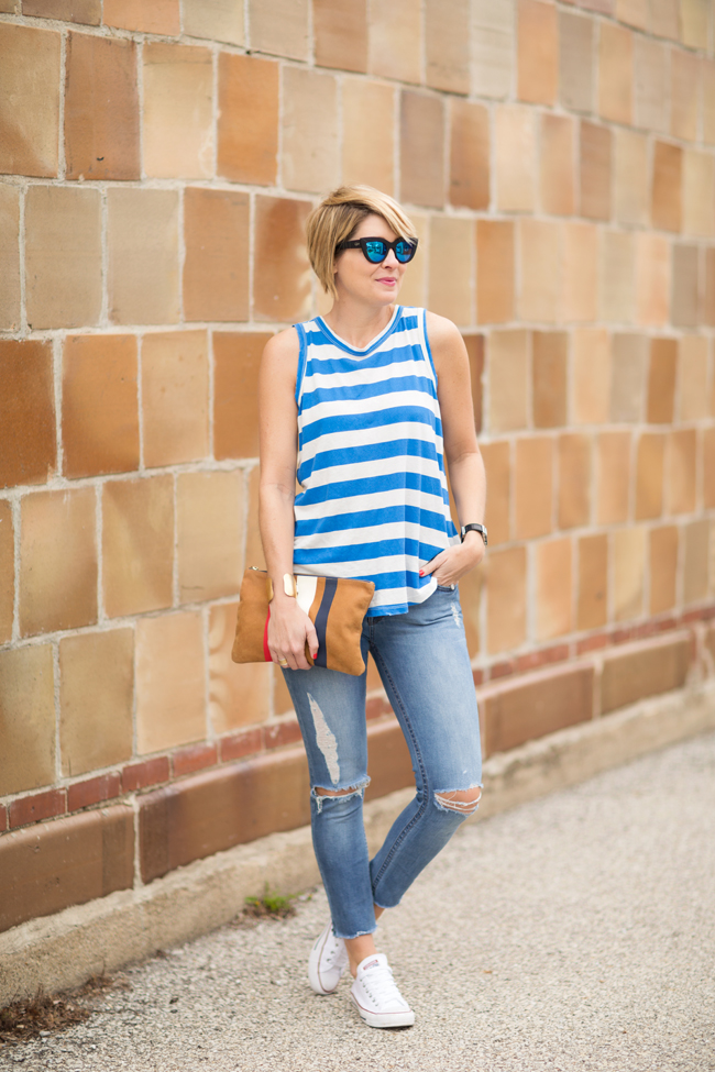 tee (Current/Elliot see Red Stripes), denim (dl1961 see SIMILAR), sneaks (Converse), clutch (Clare V), shades (Quay), ring (Anna Beck), cuff (Lela Ray Jewelry)