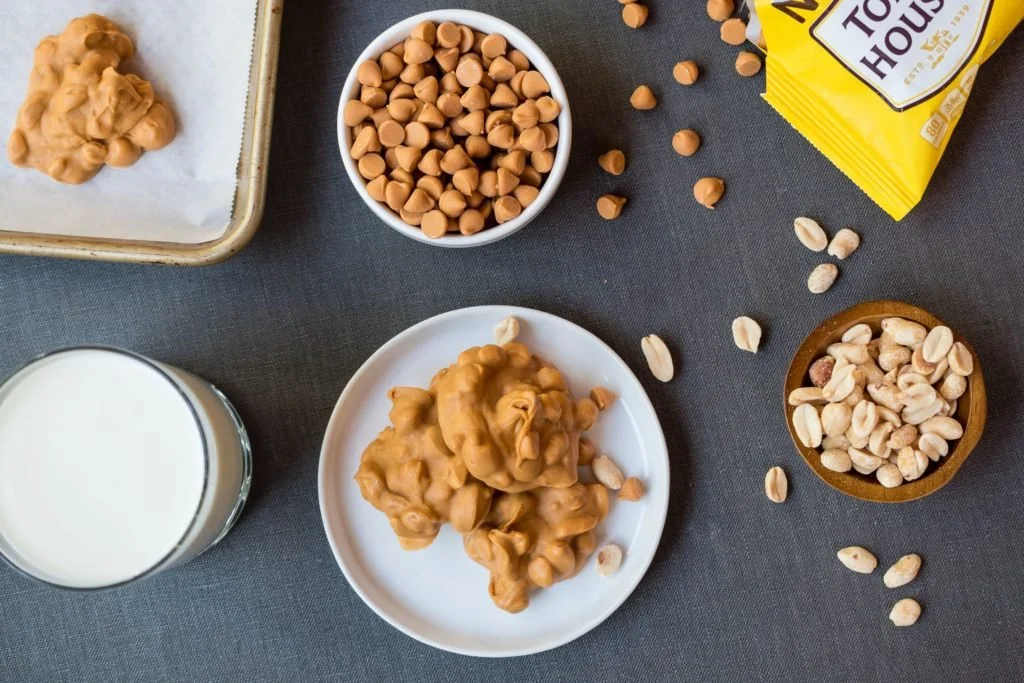 In a microwave-safe bowl, melt butterscotch chips. Add peanut butter and stir to combine. Add peanuts and a scoop of protein powder and give it another good stir. Drop large dollops onto a baking sheet, lined with wax paper. Place in freezer for 15-20 minutes.