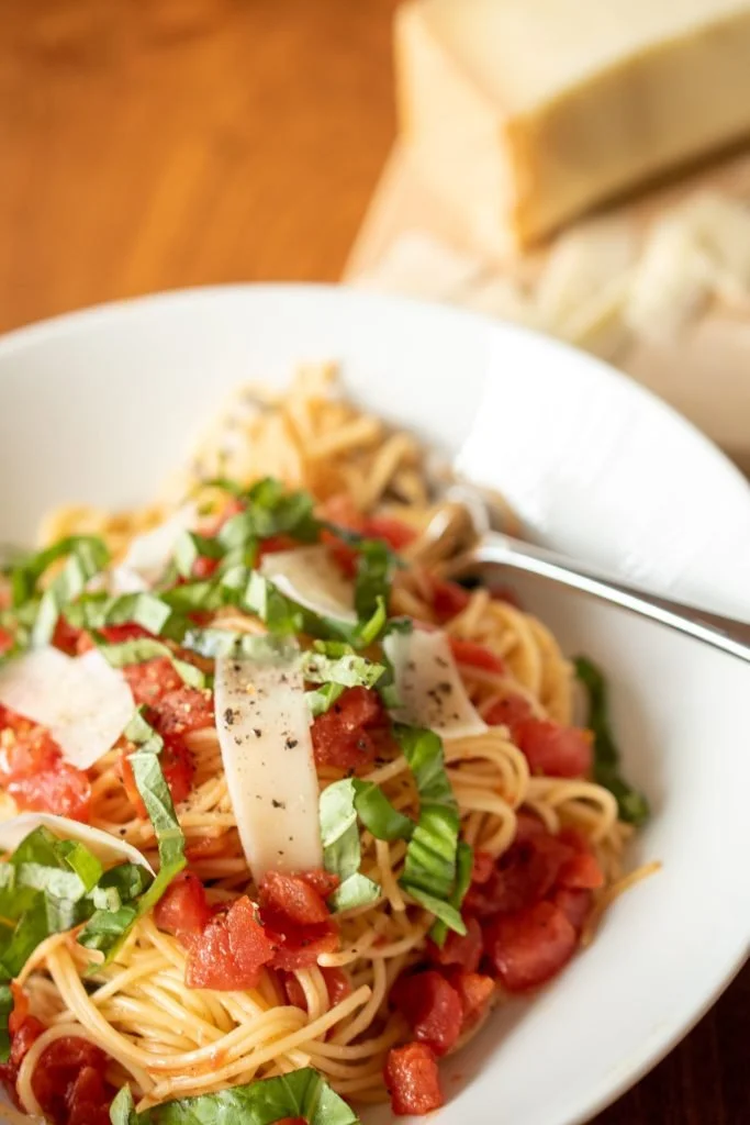 Bring a large pot of salted water to a boil and cook pasta according to package directions. Heat olive oil in a large sauté pan over medium-high heat. Sauté minced garlic for a quick minute, then add diced tomatoes with their juice. Season the sauce with salt, pepper, and Italian seasoning. Lower heat and simmer until sauce is reduced slightly. Drain pasta and add to the sauce in the sauté pan, toss to coat. Add a couple of handfuls of baby spinach to the hot pasta and stir until wilted. Build your bowl: garnish bowl of pasta with fresh basil and shaved parm. Add a glass of white wine and bon appétit.
