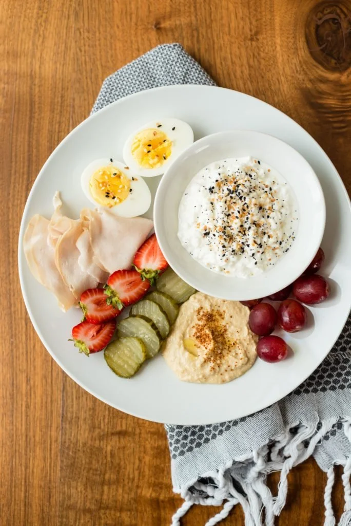 Spread hummus onto sliced turkey and roll up. Slice hard boiled eggs and season with bagel seasoning. Cut strawberries in half and use grapes as they are. Add a dollop of hummus, season with chili lime. Add a few fresh pickles (spears or slices). Top a scoop of cottage cheese with bagel seasoning. Arrange your healthy snack plate and nosh away!!