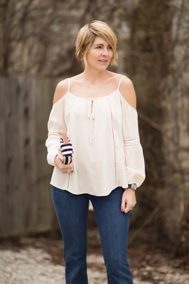 How 'bout this Neutral Flowy Number? Had her for two weeks, already worn her 3 times. Cold Shoulders are all the rage right now