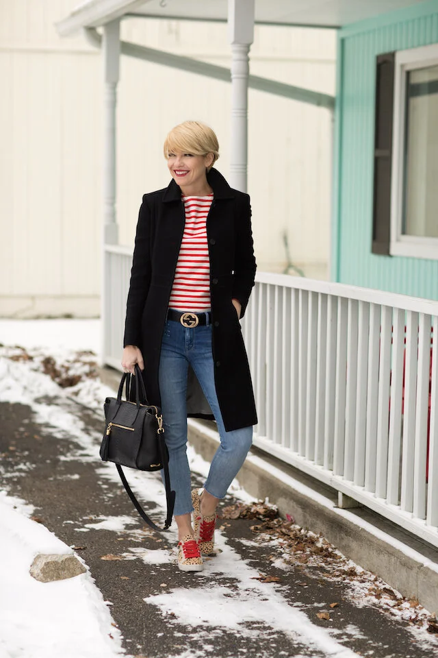 Nothing like the impending Valentine's Holiday to get me all in the mood to sport red. Red Lip, Red Stripes, Red Laced Sneaks...you name it, I'm into it! I've long been a lover of the casually polished look